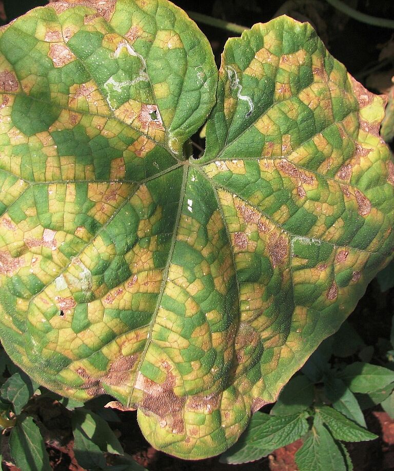 Los patógenos de mildiu velloso infectan sobre todo las hojas, pero ocasionalmente también los tallos y frutos. Causan lesiones en la superficie superior de la hoja, limitadas por los nervios y de color que amarillo, que, más adelante, cambia a marrón. En el envés de las hojas aparecen puntos algodonosos que primero son blancos y luego gris-marrones. Se trata de hecho de la esporulación de los patógenos que emergen de los estomas.