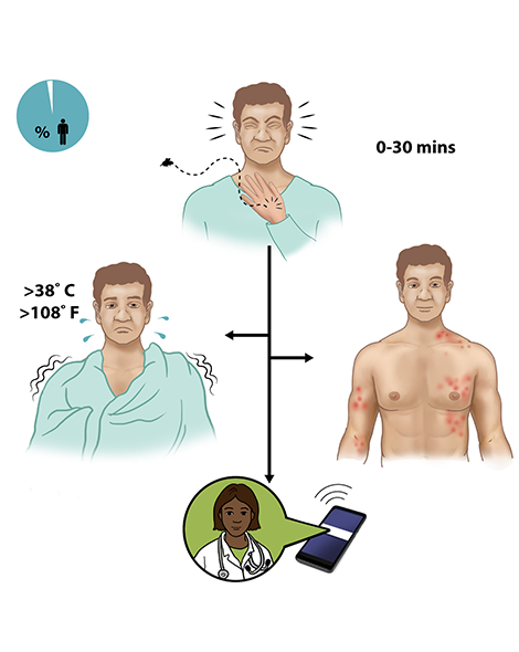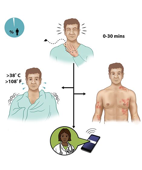 En caso de presentar fiebre o una reacción del grado 1, deberá contactar con un médico. Se puede optar por observar un rato al paciente y ver cómo evoluciona. En este caso, se recomienda acudir a un hospital para su observación, puesto que la reacción se puede agravar pasado un tiempo.