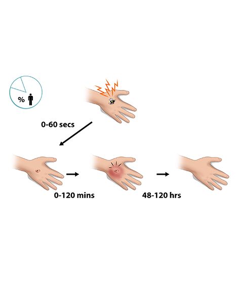Las picaduras reiteradas (a veces después de la segunda o tercera) pueden provocar una reacción alérgica, también denominada reacción general sistémica o anafiláctica, en apenas un 1 % de la población. Debido a que las reacciones alérgicas conllevan la presencia de anticuerpos, formados durante una picadura previa, las mismas no pueden aparecer cuando se es picado por primera vez. Las reacciones alérgicas suelen aparecer poco después de la picadura (entre unos segundos hasta treinta minutos después).