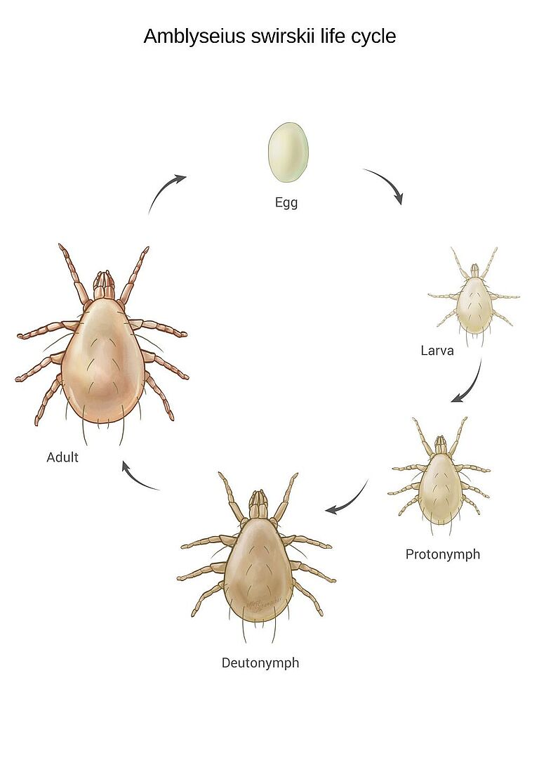 El ciclo vital de Amblyseius swirskii consta de huevo, larva, protoninfa, deutoninfa y adulto. Los huevos se depositan en el envés de las hojas, a menudo en la axila de las nervaduras. Son ovales, de color blanco y miden aproximadamente 0,14 mm de diámetro. Las larvas tienen seis patas, son del mismo color que los huevos y sólo ligeramente más grandes. Las larvas de Amblyseius swirskii no necesitan alimentarse. Las ninfas son más grandes que las larvas, tienen ocho patas y son de color amarillo blanquecino. Los ácaros adultos tienen ocho patas, son de color blanco translúcido y tienen el cuerpo plano y alargado. Miden aproximadamente 0,4 mm de longitud. Los machos son más pequeños que las hembras. Los ácaros son muy móviles y buscan activamente alimento en el envés de las hojas. A menudo se reúnen en las axilas de las nervaduras de las hojas para descansar. Su color puede variar en función de la presa ingerida, y oscila entre el blanquecino casi lucente y el blanco opaco o amarillo. Por su tamaño y color son difíciles de detectar en los cultivos.