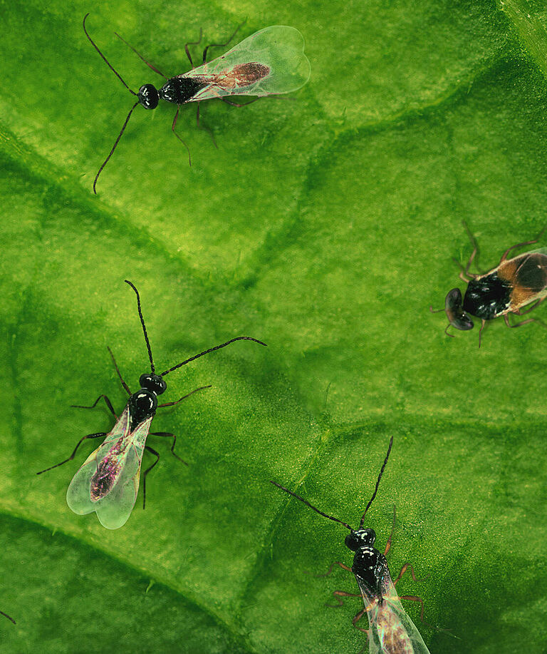 Los pulgones son conocidos por infestar una amplia gama de cultivos y causar daños al chupar la savia de las plantas y transmitir virus vegetales. Las avispas parasitarias, como Aphelinus abdominalis (Aphilin), Aphidius colemani (Aphipar), Aphidius matricariae (Aphipar-M), Aphidius ervi (Ervipar) y Praon volucre, Ephedrus cerasicola (Aphiscout) son especialmente eficaces en el control de las poblaciones de pulgones.